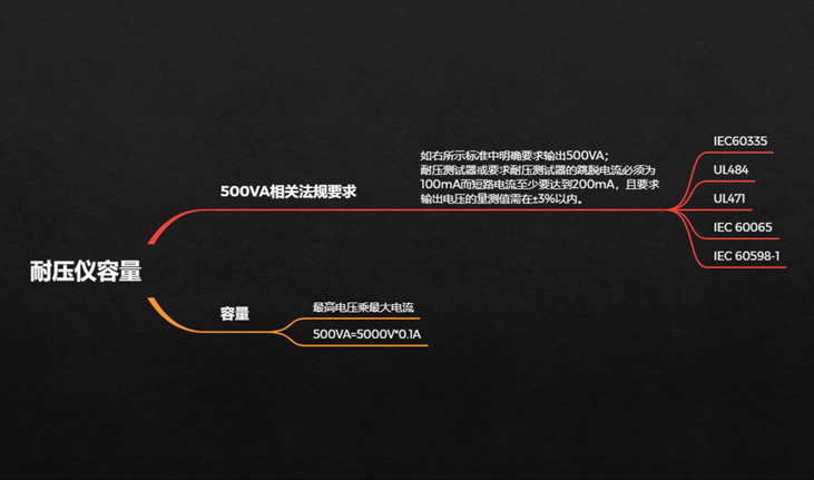 1.根据相关法规的要求,IEC60335,IEC60065,IEC60598-1,UL484,UL471,以及相应GB4706.1-2005,GB8898-2001,GB7000.1-2007等要求,明确表示耐压测试仪的输出容量需要达到500VA;耐压测试仪或耐压绝缘测试仪的跳脱电流需要达到100mA,而短路电流需要达到200mA,且要求输出电压的测量精度需要在3%以内。
